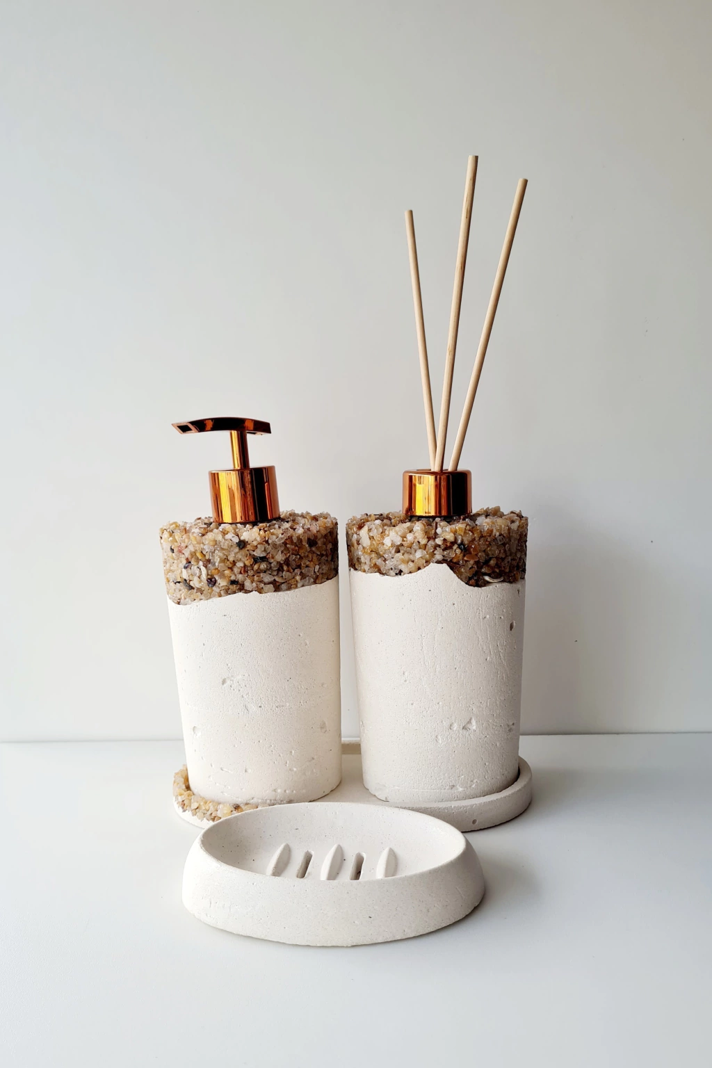 Renove seu lavabo ou banheiro com o exclusivo Kit Augusta, desenvolvido artesanalmente em cimento e granilite, combinando beleza, durabilidade e design único.